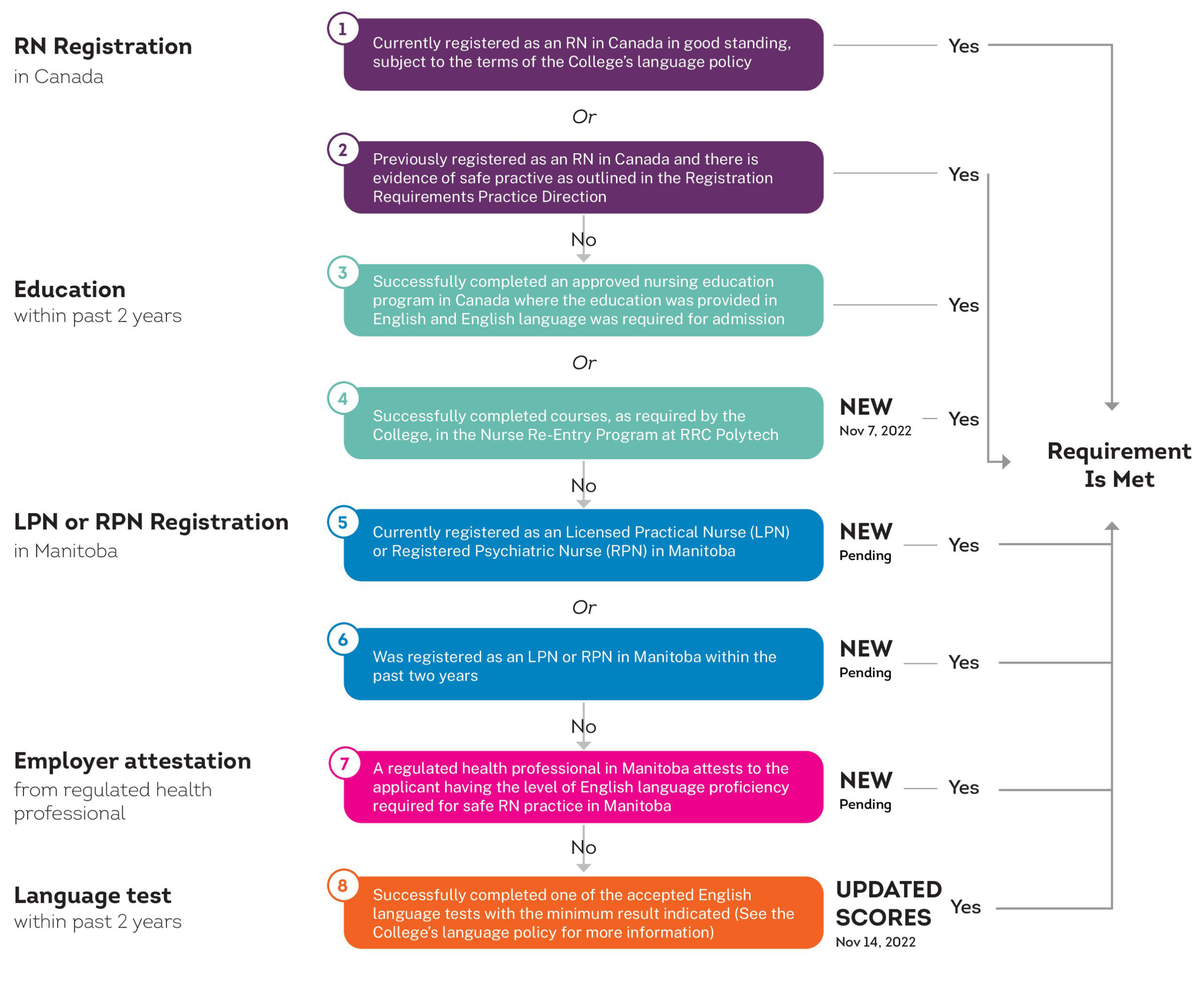 As part of the modernization efforts, applicants will now have three additional ways to demonstrate English language proficiency, including current or recent registration (within the past two years) as a licensed practical nurse or registered psychiatric nurse in Manitoba, as well as a letter of attestation from a regulated health professional in Manitoba. The latter brings Manitoba in alignment with other provinces who already accept letters of attestation as proof of language proficiency. Notably, the College will require the letter to come from a regulated health professional who has closely worked with the applicant in a clinical setting.