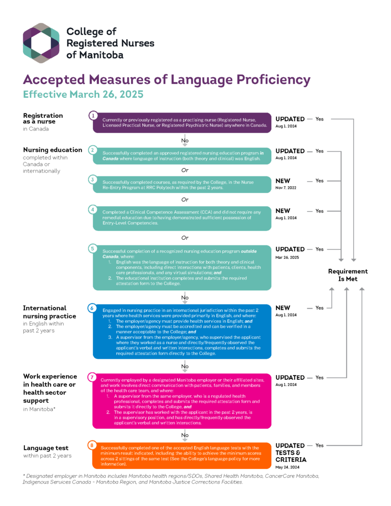 The ways that an applicant can demonstrate English language proficiency have been significantly updated since the fall of 2022, with major updates implemented on August 1, 2024 and March 26, 2025. As a result of a national review of language testing benchmarks, as well as the College’s own review of additional ways to demonstrate language proficiency, there are now 8 different ways that an applicant can meet the requirements for RN registration in Manitoba: In addition to the updated testing scores shown below, applicants can now demonstrate their language proficiency via current or previous registration as a nurse in Canada, nursing education completed in Canada or internationally, international nursing practice in English within the past 2 years, and an employer attestation letter. Further details on all accepted language proficiency measures and requirements are outlined in our language proficiency policy.